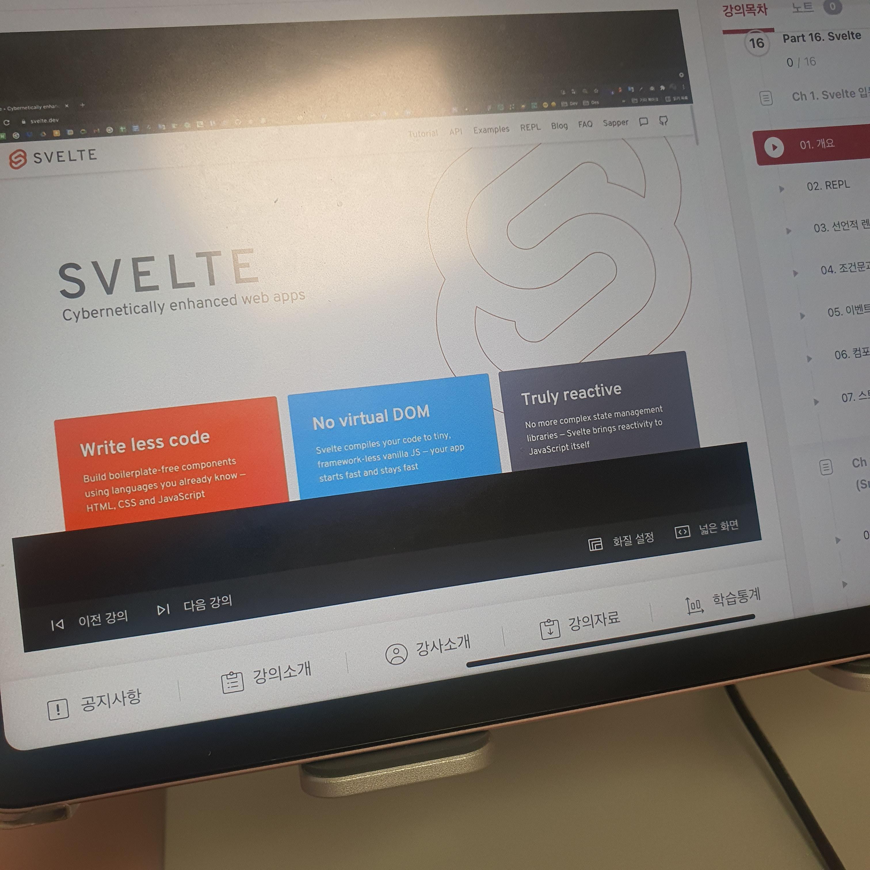 챌린지 42일 차. 프론트엔드에서 프론트엔드 개발자가 사용할 수 있는 프레임워크는 Vue.js, React, Angular 가 있다. 이 세 가지가 전부가 아니라 다양한 종류의 프레임워크들도 있는데 그 중 하나가 SVELTE이다. 프레임워크가 다양한만큼 나에게나 프로젝트에 잘 맞는 프레임워크를 선택하는 것이 일반적이지만 최근에는 특정 프레임워크 한가지만을 알고 있는 개발자가 아닌 다양한 경험이 있는 개발자들을 선호하는 추세이다. 그간 공부했던 프레임워크만큼 깊게 배우진 않을 예정이지만 Part16의 SVELTE 강의를 통해 SVELTE를 어떻게 사용하는지 입문하는 정도로 강의가 진행되며 공부해볼 예정이다.