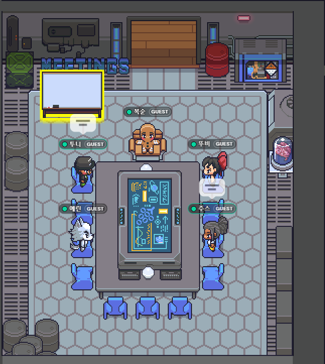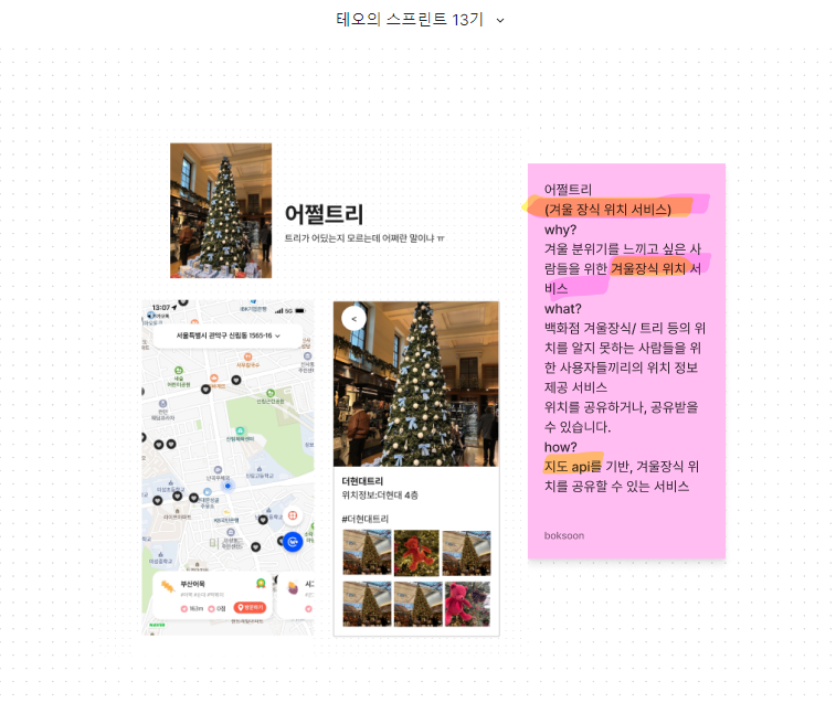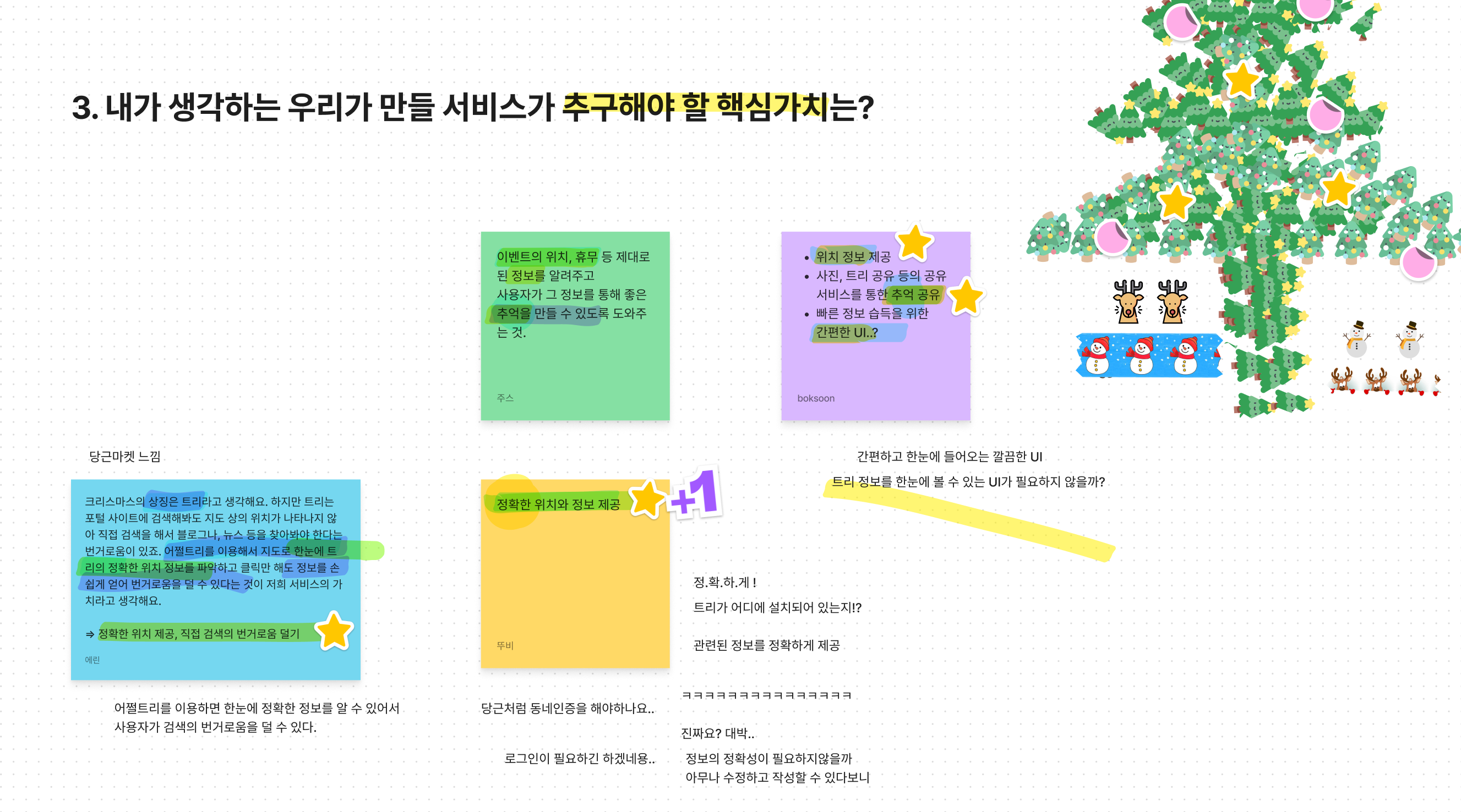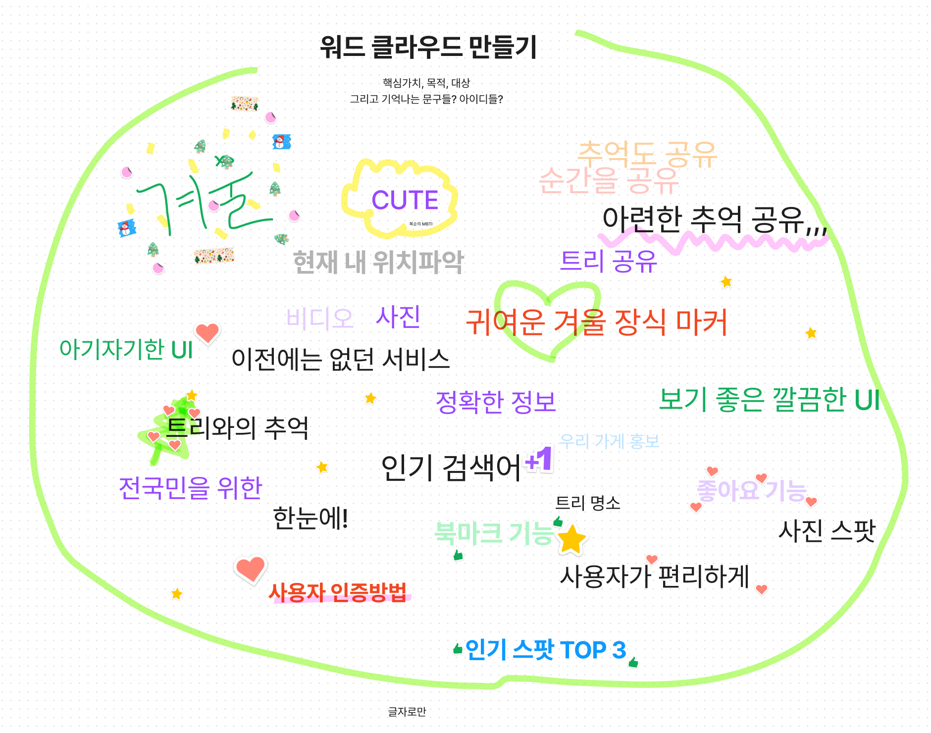 둘째 날에는 지도를 그리며 본격적인 기획 회의가 시작되었다. 다 같은 아이디어를 생각하며 모였지만 생각하는 것들은 다를 우리들을 위해 서로의 시야를 맞춰보는 시간을 가졌다. 우리끼리 얘기하던 중에 다른 팀이 폭파되어 우리 팀으로 오고자하는 팀원이 있어서 소중하게 맞이해주었다. 제일 인기 많았던 프로젝트 주제였는데 아쉽게 해체되어 해보고 싶다던 우리 <어쩔트리> 팀으로 소중한 새 멤버가 들어왔다!! 웰컴 투니!!