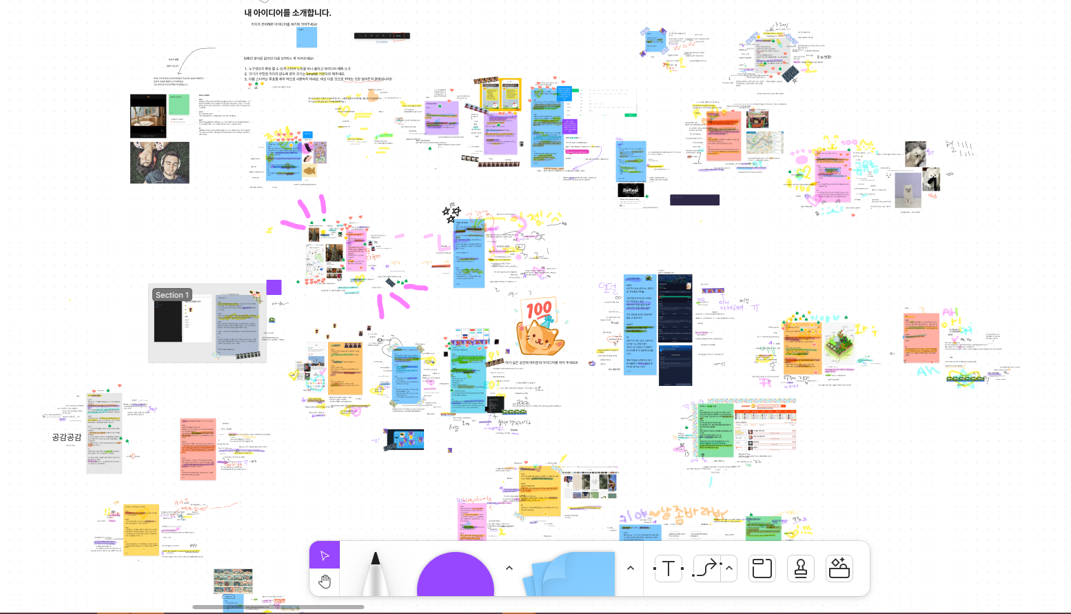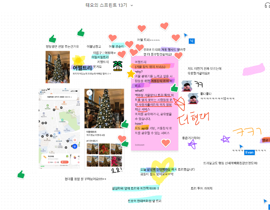 이렇게 마음에 드는 아이디어에 하트/최고/별 스티커를 붙이면서 1차 투표를, 추려진 아이디어에 참여의사를 밝혀 2차 투표를 한다. 사실 1차로 합격되고 난 뒤부터는 심장이 실시간으로 업다운됐어서 잘 기억은 안난다. 내 아이디어가 평가된다는게 일단 조금 떨렸고 꼭 이 아이디어를 진행해보고 싶어서 안절부절했다. 근데 정말 개쩔게도 내 아이디어도 최종후보로 올라 팀 빌딩이 되어부렀다.