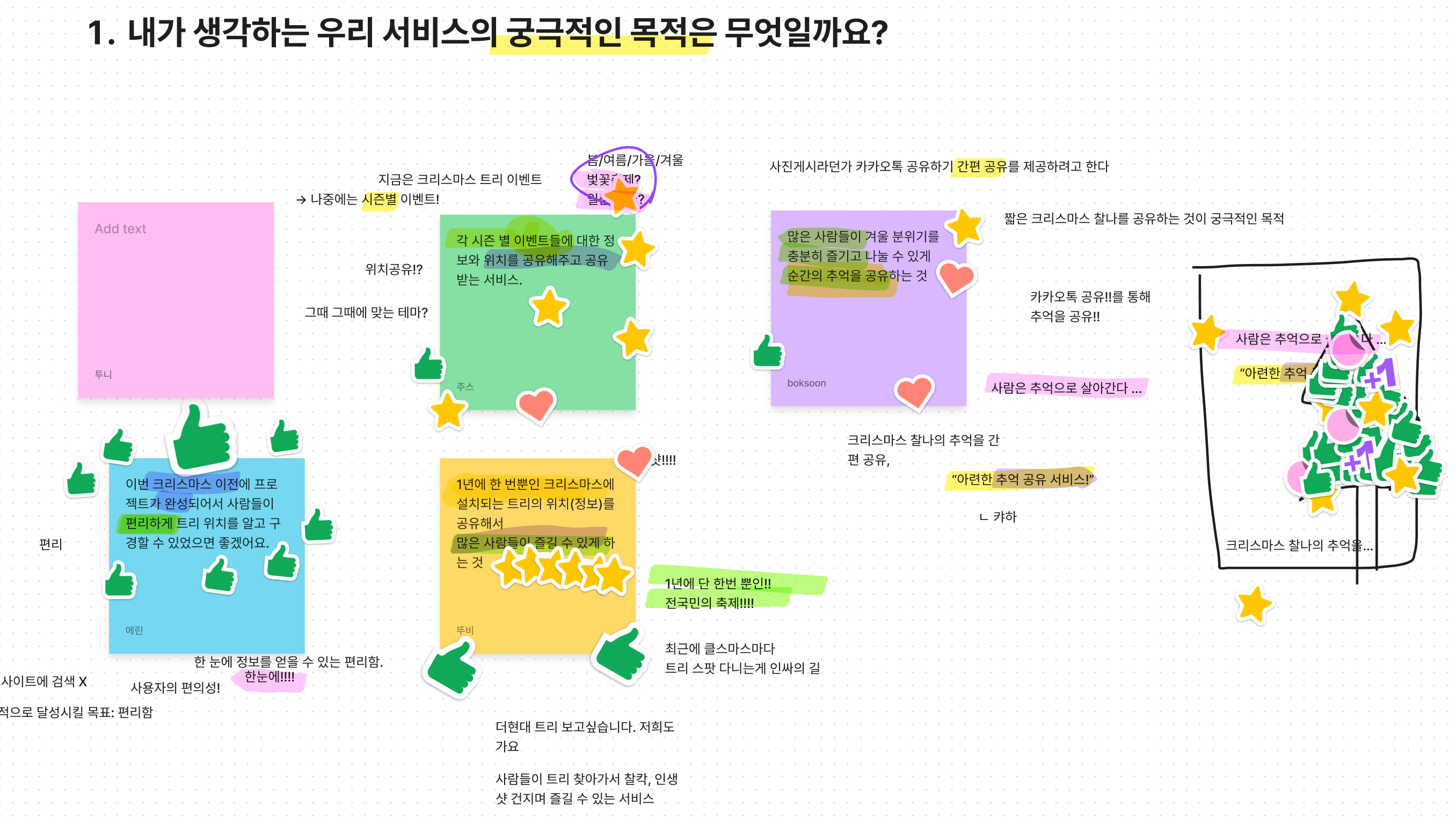 피그잼내에서는 여러 기능들이 지원이되어서 둘째 날에는 프로젝트에 대한 이런저런 아이디어를 서로 공유하고 이야기해보는 시간을 가졌다. 프로젝트 기획과 필요한 기능들, 핵심가치 등등을 정리해보며 이것저것 낙서도 하고 어쩔트리의 메인인 트리도 같이 그리면서 놀았다.사실 만난지 이틀밖에 안되서 약간 어색하긴했지만 이런저런 이야기를 나누고 프로젝트 기획도 하면서 많이 친해진 것 같다. 이때까지만 해도 님 호칭 없이 팀원들을 부르는 것이 약간 어색했는데 이제는 익숙하게 잘 나온다. 이때까지만해도 프론트엔드 개발자들만 모인 프엔팀이였다.