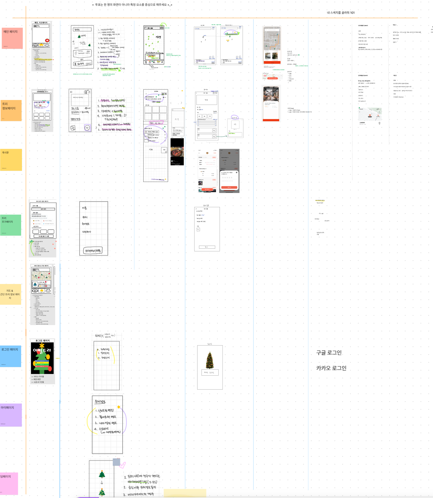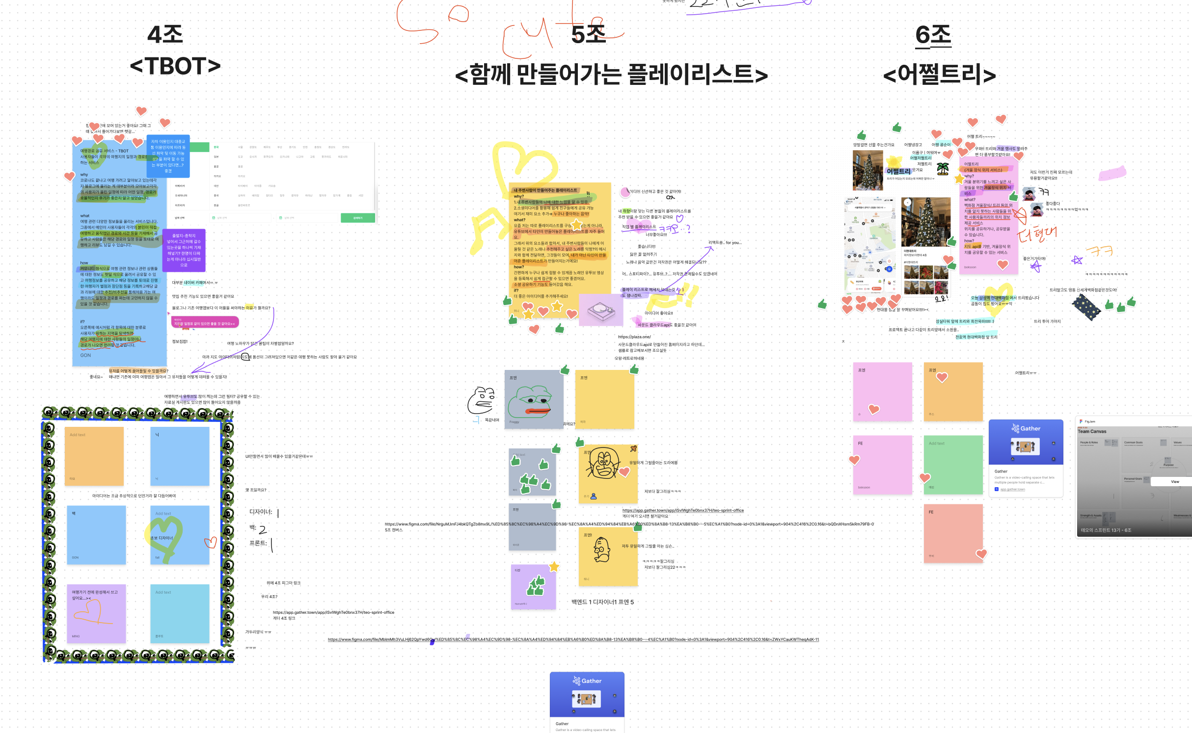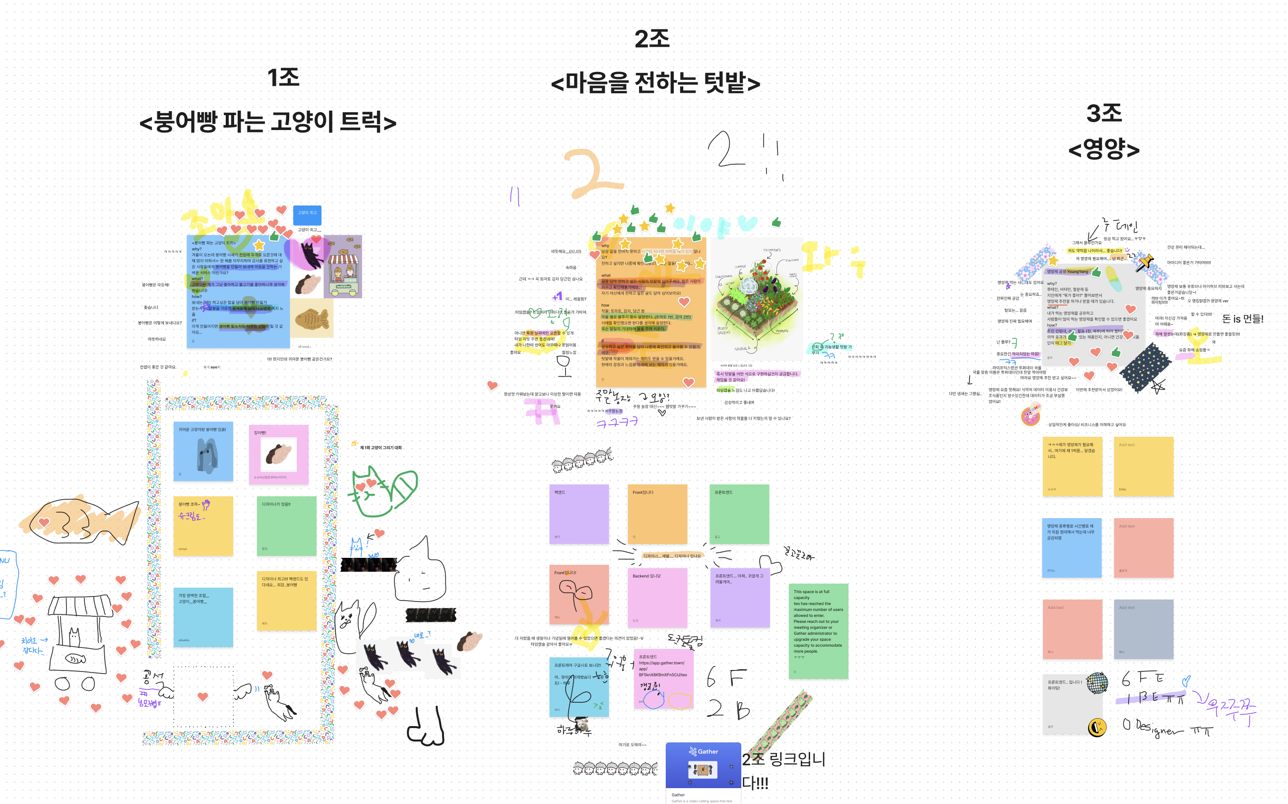 셋째 날은 기획의 마지막 날로 본격적으로 개발을 위해 어떤 기능들이 필요할지 정리해보는 시간을 가졌다. 스프린트는 짧은 기간이지만 팀원들은 모두 서비스를 완성하고자하는 마음이 있었기에 디자이너를 구하였는데 생각보다 엄청 빨리 구해져서 이 날의 기획회의를 같이 진행하였다. 환영해요 쿠쿠! 우리 팀에 와줘서 너무 고마워!! (겁나 짱짱 디자이너임) 셋째날에는 이렇게 완전체가 된 디자이너와 프론트엔드 팀으로 진행했다! 이렇게 완전체가 되어버린 짱짱 6조!! 숙제로 그려왔던 페이지들을 펼쳐보며 스토리보드를 그리며 기획회의를 했더랬다. 아래 사진에서 세로로 두번째 줄에 있는 허접그림이 내가 그린 페이지들이다.