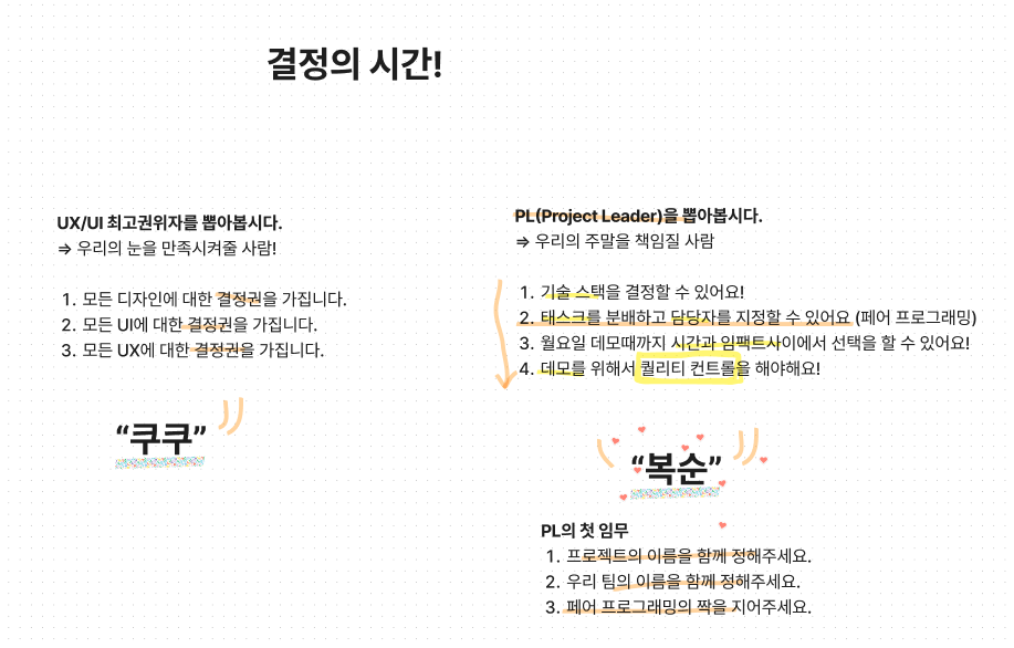 후에는 이렇게 디자인 최고권위자와 프로젝트 리더를 뽑게 되는데 디자인 최고권위자는 당연하게도 하나밖에 없는 소중한 우리 쿠쿠가 뽑혔고.. 어째서인지 프로젝트 리더로 내가 선정되었다. 나는 허접인데.. 라는 허접한 생각도 들긴 했지만 어째서인지 내가 뽑혀버렸다.