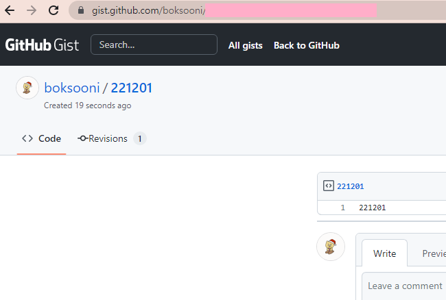 gist를 생성하게 되면 상단 주소창에 url에 gist_ID가 생성되는데 따로 복사해둔다.