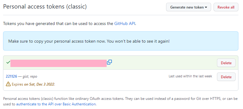 비밀번호 입력 후에 Note에는 아무거나 작성하고(나는 오늘 날짜를 적었다. 221201) repo와 gist에 체크를 하고 토큰을 발행한다.