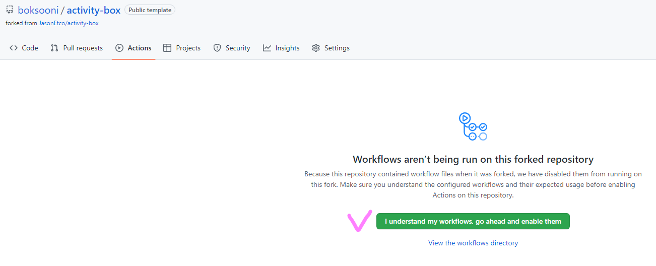 후에는 나의 깃허브 내 포크떠온 레파지토리로 이동 후 , Actions 탭에 들어가서 enable 버튼을 클릭해준다.
