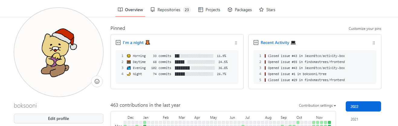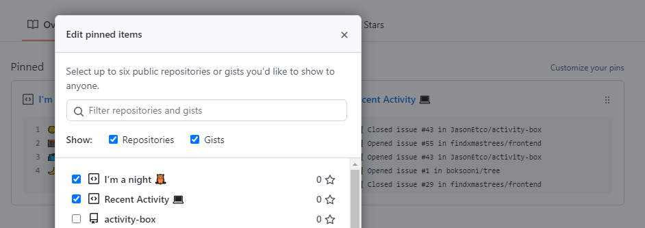 깃허브 프로필로 돌아가 customize your pins 클릭 후 해당 gist를 고정하면 완성. 나는 이전에 커밋시간을 알려주는 gist를 추가해놓아서 이번에 추가한 activity-box를 추가로 고정시켜주었다. 이전에 고정시켜둔 I'm a night는 커밋을 주로 어느 시간대에 했는지 알려주는 귀여운 gist이다.(링크첨부)