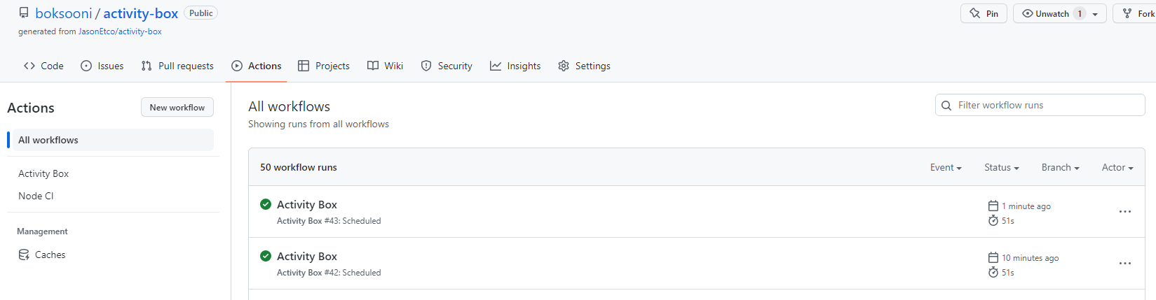 텅텅빈 깃허브가 허전해보이기 시작할 즈음, 고정된 핀을 통해 깃허브를 꾸밀 수 있는 방법을 발견했다! 나는 보여주기에 그럴싸한 레포가 없어서 따로 추가해두지않았었는데 이번에 귀여운 핀들을 발견해서 해당 핀으로 고정시켜두었다. 사용법이 생각보다 간단해서 5분이면 완성된다. 깃허브 활동내역과도 관계있는 핀들이 많아 시도해보았었는데 너무 귀여워서 하나 더 추가하는 김에 추가 방법에 대해 간단히 글을 작성해보았다. 이전에 추가한 핀은 유저의 커밋시간을 알려주는 productibe-box, 이번에 추가하는 핀은 유저의 최신 활동을 보여주는 activity-box이다. Activity-box는 활동 내용에 따라 다른 이모지들과 함께 내역을 알려줘서 너무 귀여운 것 같다. 보자마자 반해서 바로 적용시켰다.