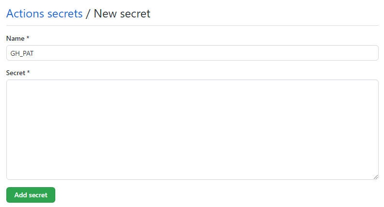 Name에 GIST_PAT으로 Secret에는 아까 발급받은 토큰 값을 넣어준뒤 secret을 생성한다.