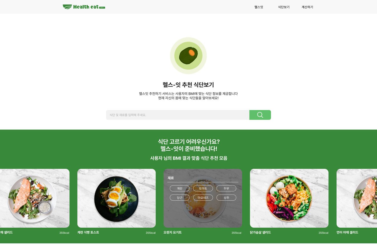 헬스잇은 BMI 계산 서비스만 제공하는 것이 아닌 개인의 BMI를 기반으로 식단을 추천해준다. BMI 계산 이후에는 개인 정보 입력 결과와 함께 BMI 범주 및 BMI 결과에 대한 코멘트, 식단 추천의 정보를 함께 제공한다. 이에 서버에 데이터로 담겨 있는 음식의 정보들을 렌더링하여 랜덤추천 할 수 있게 이쁘게 보여주었다. BMI 별 칼로리 추천로직은 백에서 구현해주었다.