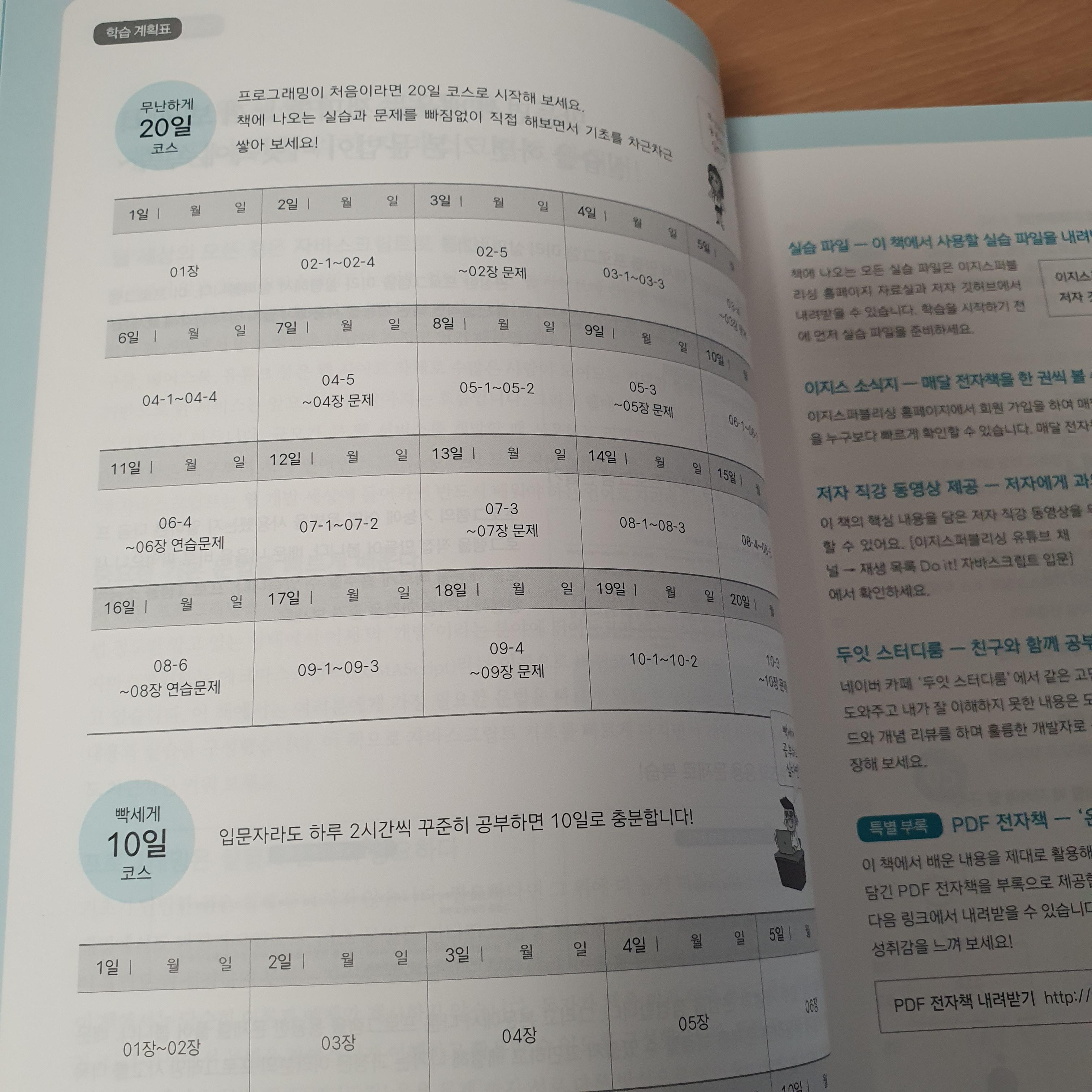 이 책은 크게 10장으로 구성되어 있는데 각각 자바스크립트의 기본 개념부터 웹 브라우저까지 쉽고 재미있게 설명해준다. 그렇지만 단순하게 이론과 예제만으로 구성되어있는 것이 아닌 직접 책을 따라 하며 프로그램을 완성하고, 문법을 보다 더 깊게 응용할 수 있는 실습파트도 각각의 챕터에 포함된다. "Do it! 실습"으로 직접 해보며 배울 수 있고, "1분 복습", "필수 개념 & 문법퀴즈!" 의 복습, "도전! 응용문제" 까지 응용하여 생각해 볼 수 있는 실습코너도 여러가지 방식으로 함께 제공된다. 또한 책의 앞 페이지만 펴보고 깔짝이다 더이상 영영 펴보지않을 사람들을 위한 코너도 준비되어있다. 바로 책에서 제공해주는 학습계획표인데, 학습량에 따라 20일, 10일 코스로 나누어서도 책을 씹고 뜯고 맛보고 즐겨볼 수 있다.