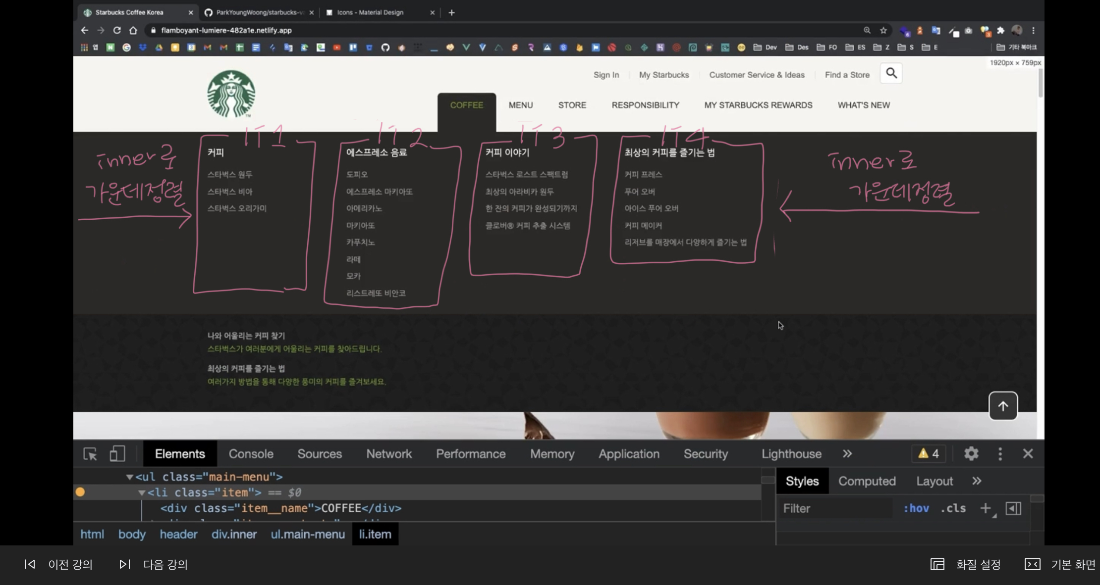 챌린지 05일차. 스타벅스 웹 사이트의 상단 메뉴 부분 만들기를 끝냈다. 사실 혼자서 한다면 절~~대 못했을 거 같지만 강사님이 이해하기 쉽게 CSS요소들을 전부 설명해주시기에 차근차근히 따라나가고 있는 중이다. 이전에 메뉴 버튼을 만들고나서 버튼 하단의 펼쳐지는 드롭다운 메뉴들을 만들었는데 구조적으로도 차근차근 설명을 잘 해주셔서 한눈에 파악하기 쉽도록 정리를 해보았다.