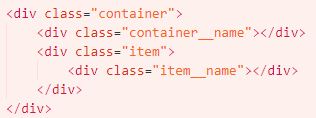 위와 같이 클래스명을 선언하게 된다면 CSS 작업을 할 때에 .container .name 으로 작성할 것이다. 하지만 이렇게 되는 경우 name이라는 클래스명이 2개이기 때문에 원하는 css 작업을 item 하위의 name 부분에 입혀지는 불상사가 발생하게 된다. 이런 경우를 대비하기 위해 적는 일종의 약속이 BEM이며 아래와 같이 수정할 수 있다.