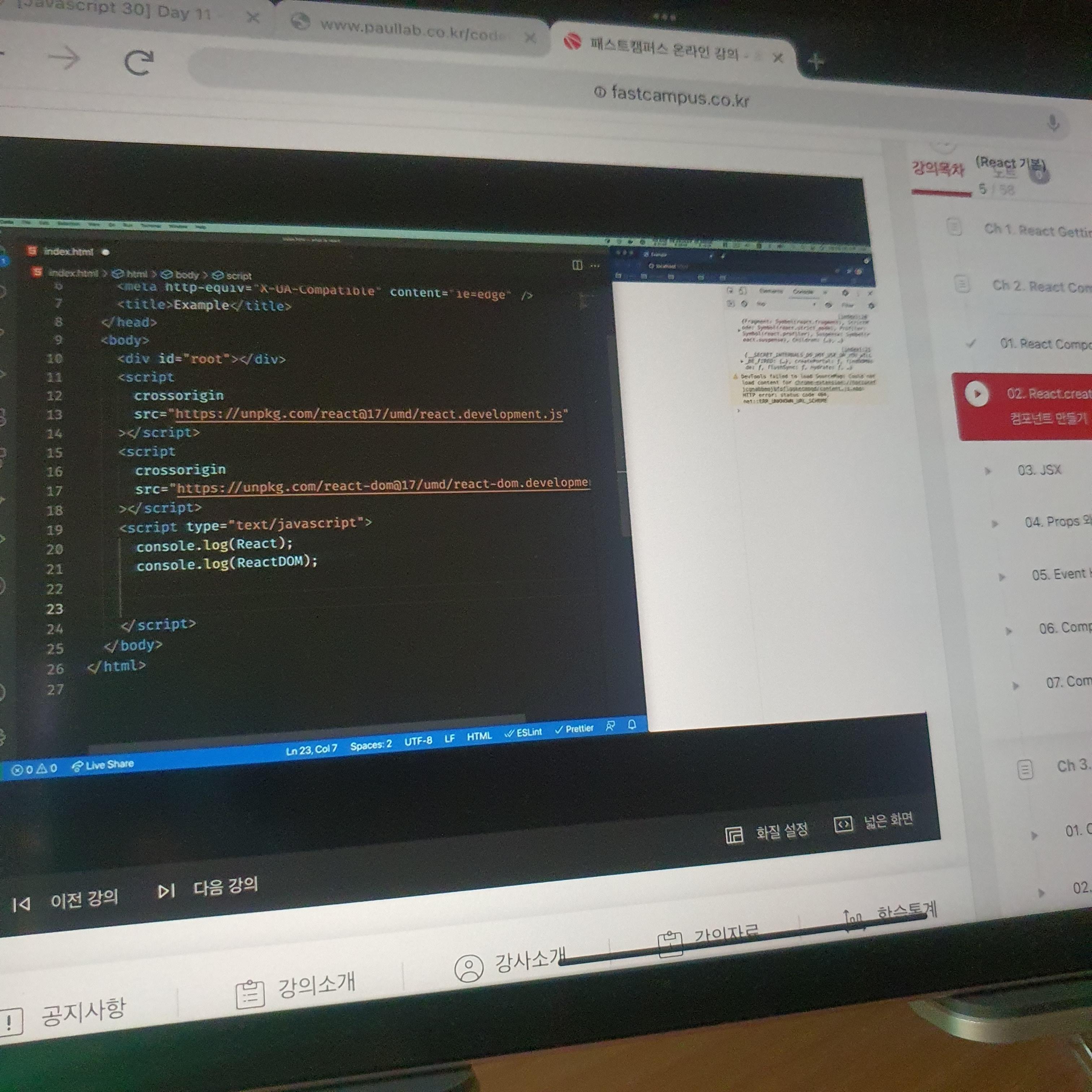 챌린지 24일 차. 아직 어려운 듯 안 어려운 듯 친한 듯 안 친한 리액트.... 원래 오늘은 리액트 강의를 쭉 빼고 프로젝트를 만드는 강의를 진행해보려 했는데 낮잠을 자버려서 계획을 수행하지 못했다. 그래서 못한 만큼... 새벽 공부를 쭉 해보려 하는데 집중이 잘 될지 모르겠다. 요즘 전자기기를 보면 눈이 시려서... 눈물이 막 난다... 과연 이 눈물은 눈이 시려서 나는 걸까... 내 코딩 실력 때문에 나는 걸까..?